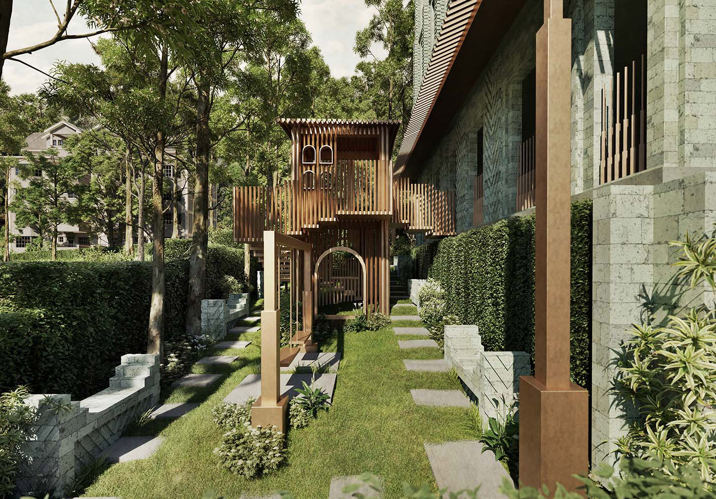 + Children's playground set within a small landscape garden with benches